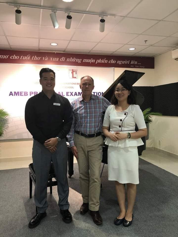 Giám khảo AMEB Glenn Riddle (bên trái), Cô Ths. Nguyễn Thị Thùy Thường - CEO hệ thống Dolin Music School (ở giữa) và thầy phiên dịch viên Tom (bên phải)