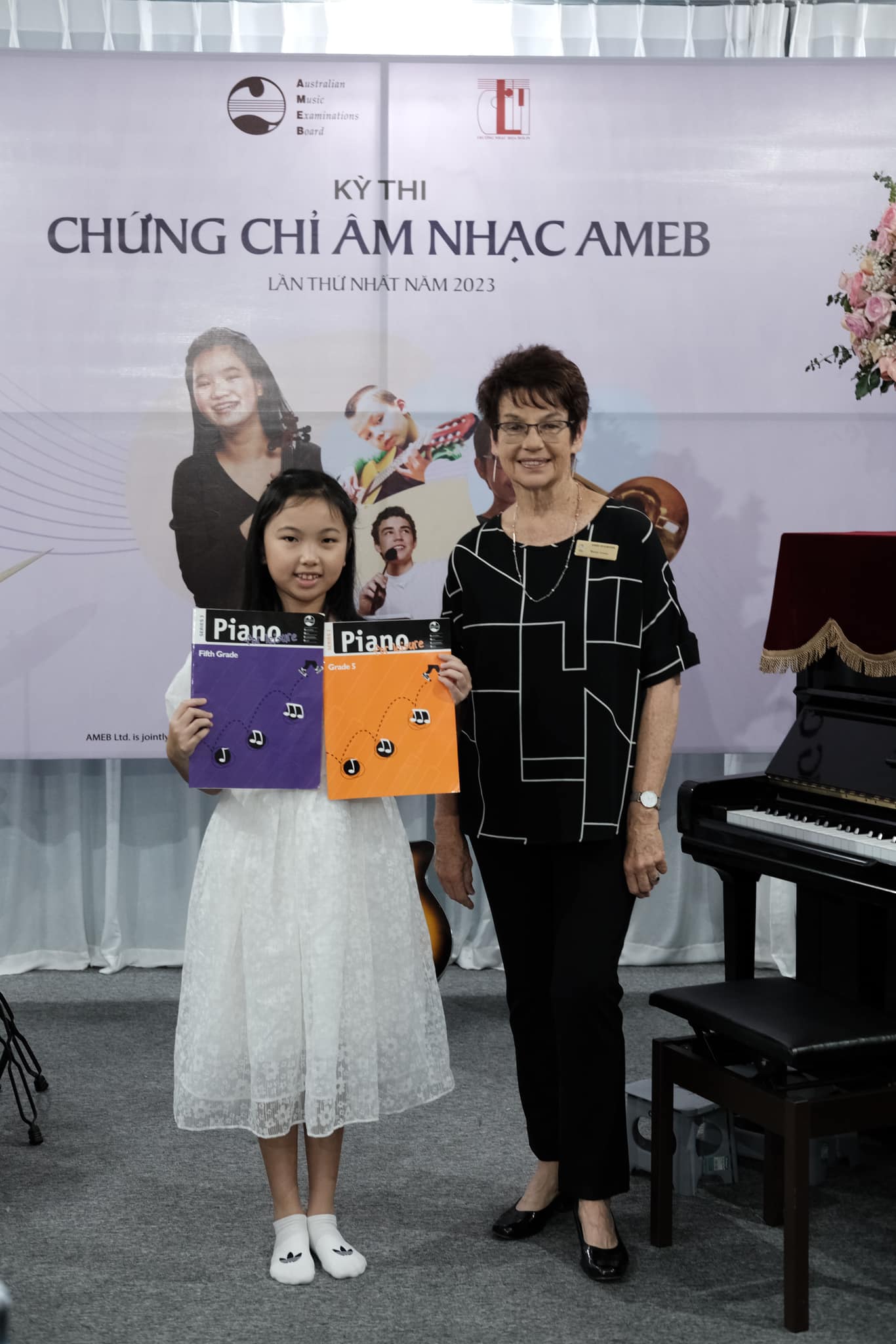 Học viên Dolin chụp hình cùng giám khảo quốc tế Wendy Lorenz - người sẽ cầm cân nảy mực kỳ thi chứng chỉ AMEB năm 2023