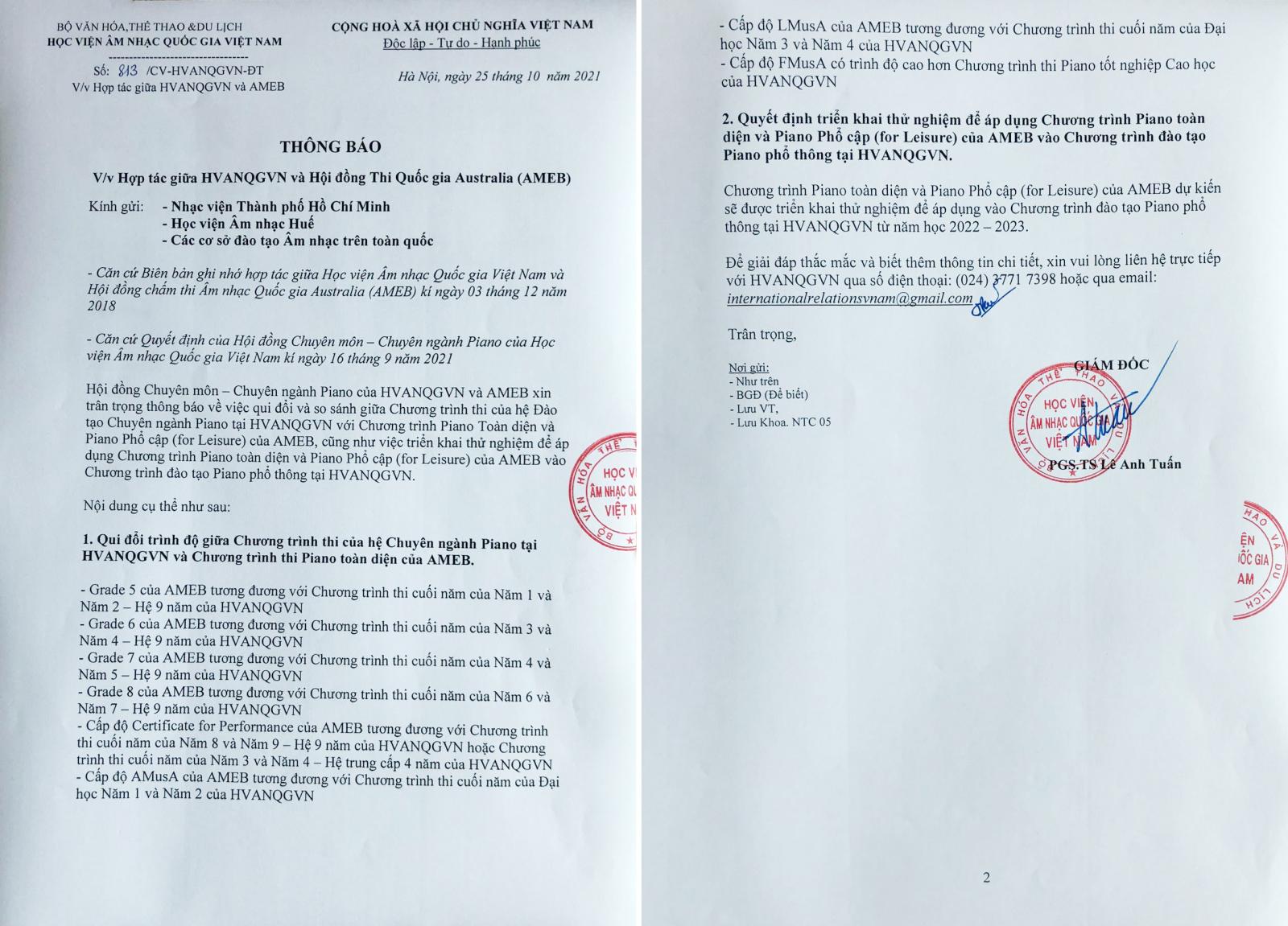 2. Học Viện Âm Nhạc Quốc Gia Việt Nam Đã Chính Thức Qui Đổi Trình Độ Chương Trình Piano Toàn Diện Của AMEB Và Chương Trình Thi Của Chuyên Ngành Piano: